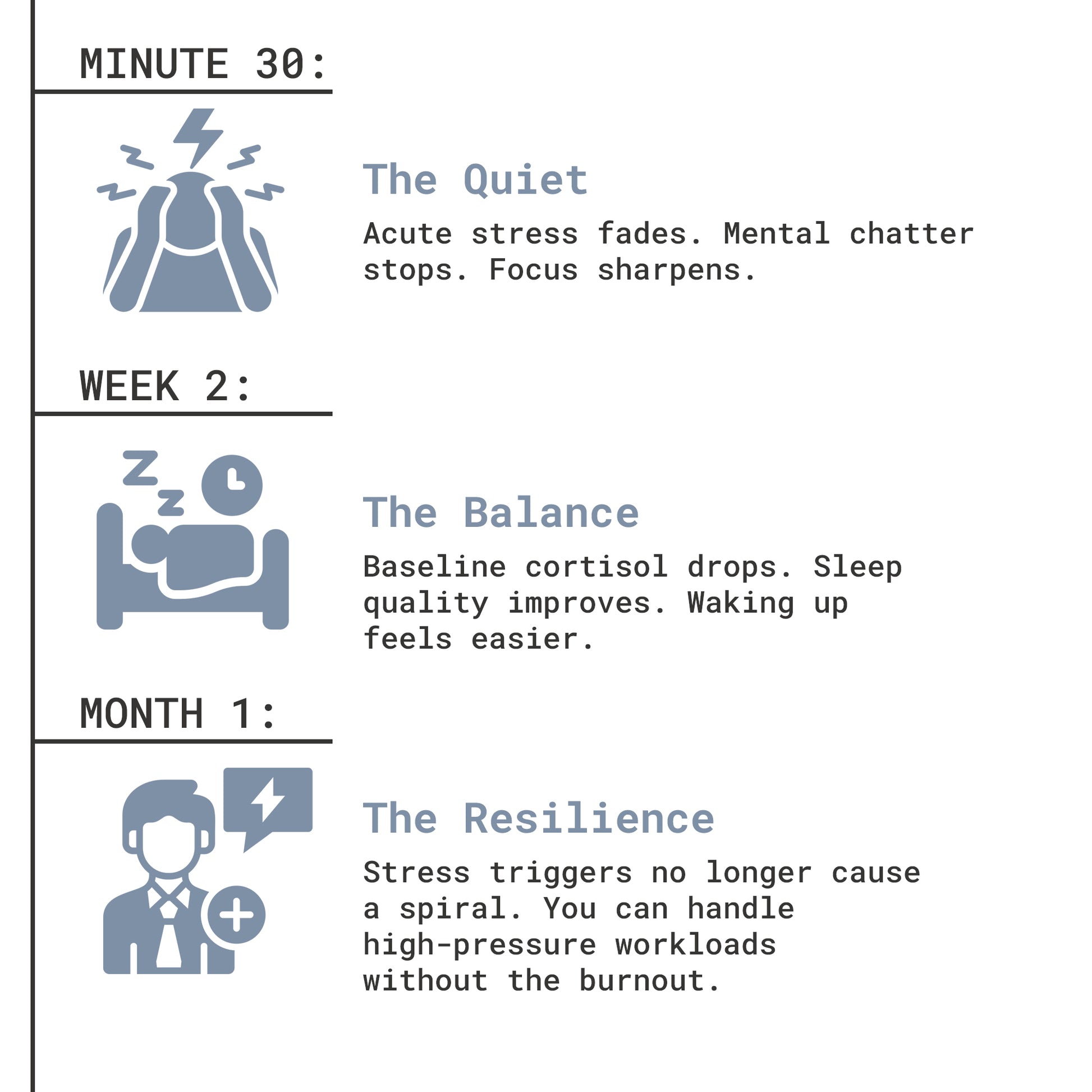 Long Term: The KSM-66® Ashwagandha and Rhodiola build up in your system over 2-4 weeks to regulate baseline cortisol and improve resilience.